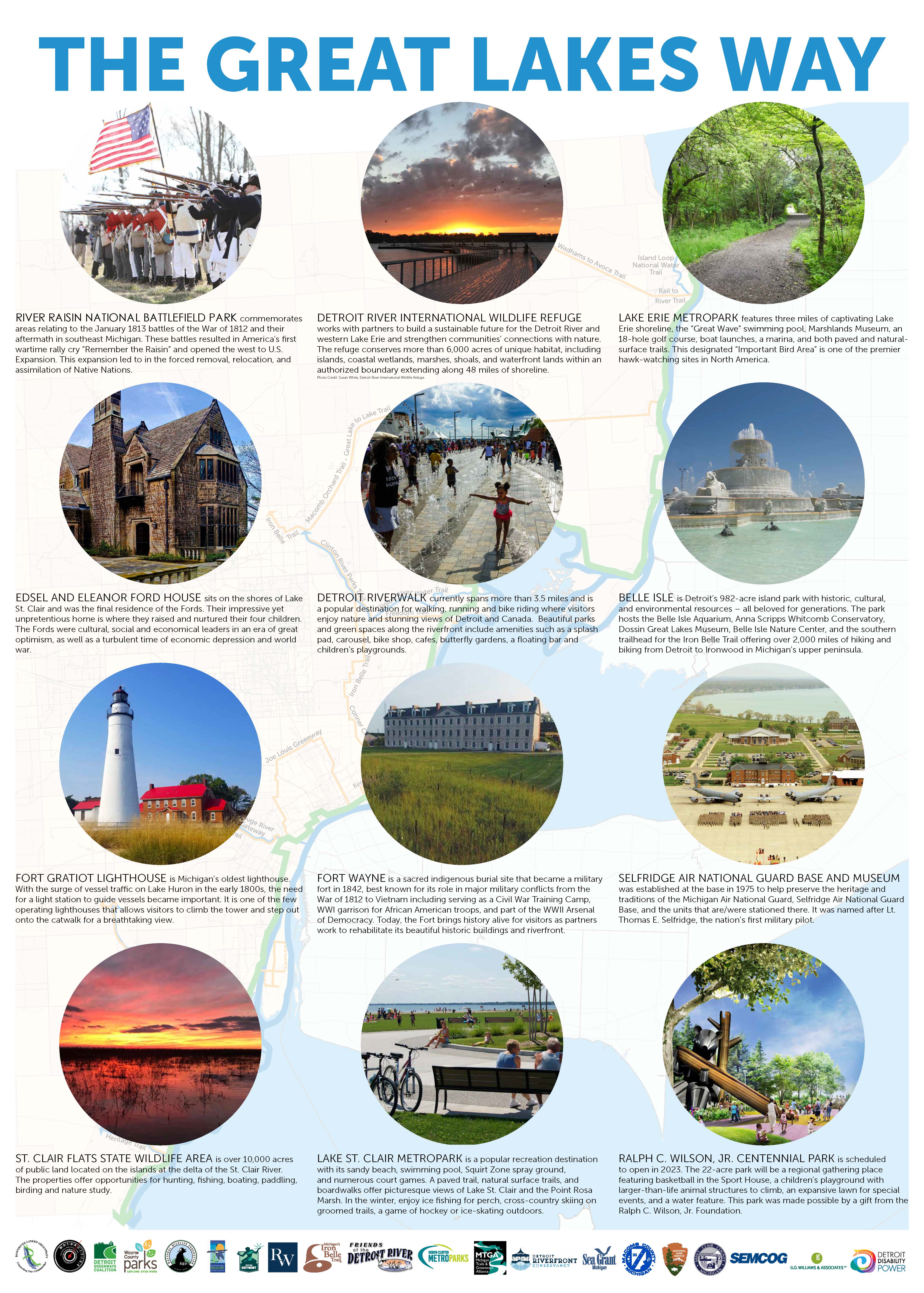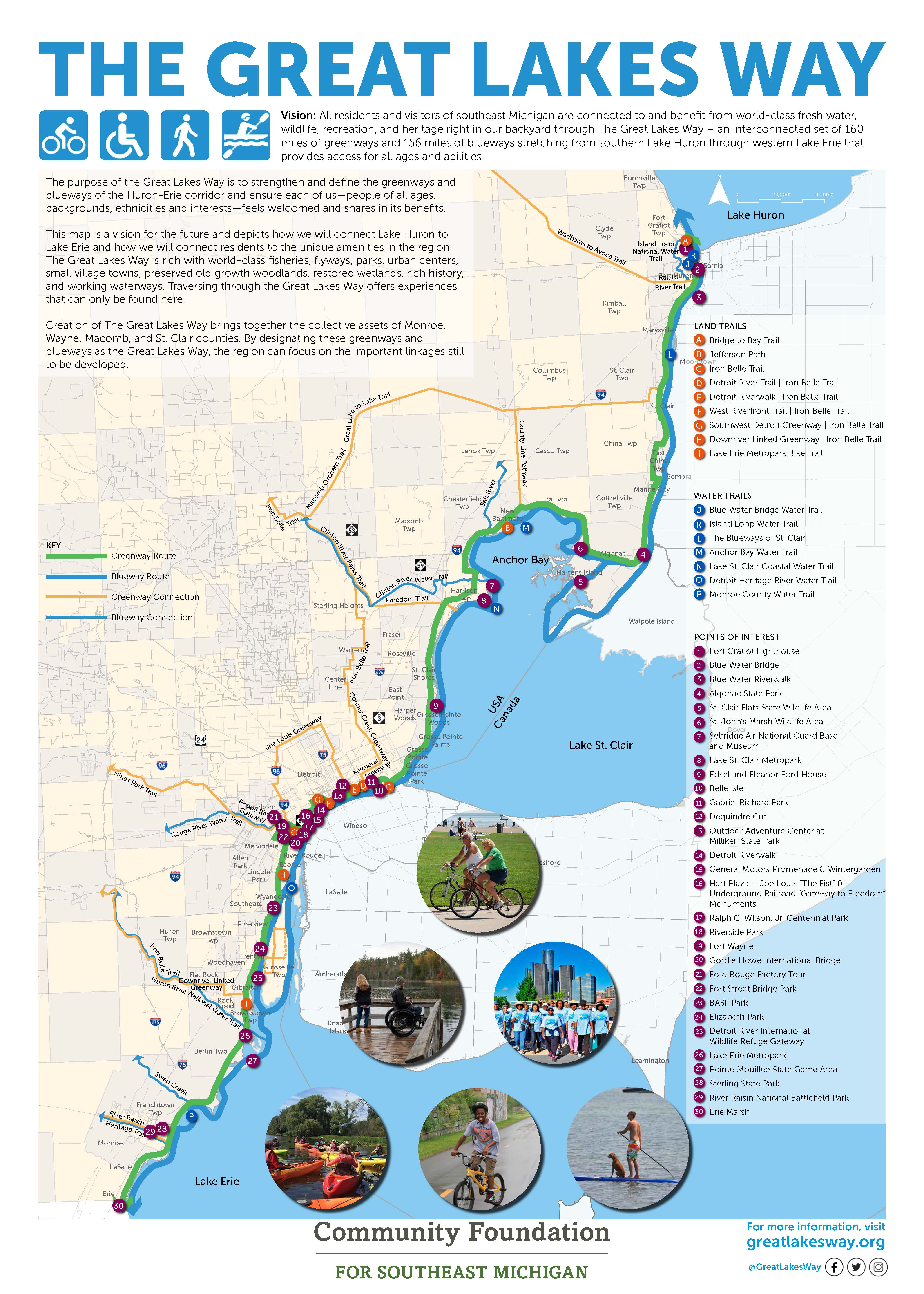 The Great Lakes Way is an interconnected network of over 160 miles of land trails (greenways) and 156 miles of water trails (waterways) in Michigan. Established by the Community Foundation for Southeast Michigan, the Great Lakes Way stretches between Lake Huron and western Lake Erie. It will positively impact the community by providing recreational activities and health benefits; providing access to cultural and historical sites and natural areas; creating tourism; establishing equity; and is free to utilize year-round.