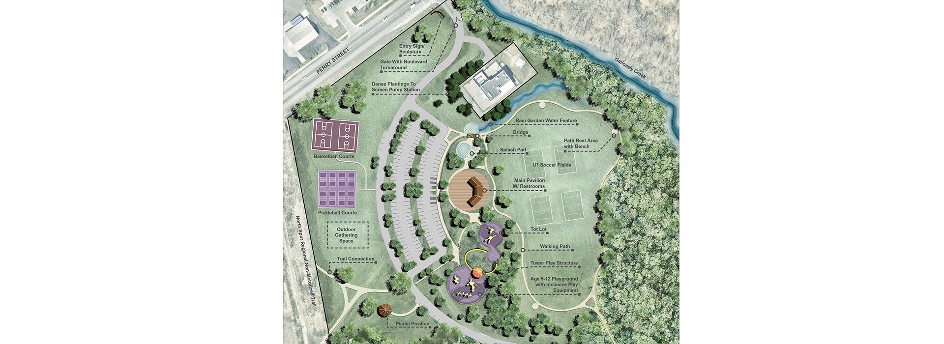 The next step involved developing a conceptual site plan for the park. Due to its large size and the significant importance of safety and maintenance, we consolidated the active program elements into one area to create a central hub of activity. The program elements include a state-of-the-art play structure, picnic pavilions, walking trails, and new bathrooms. Lastly, we prepared a cost estimation for the park. Considering the scale of the project, we broke it down into smaller phases to effectively accomplish the Pontiac Community Foundation’s goals. Our team presented the final concept at a City Council meeting, and we received overwhelming support from both the Council members and the community.