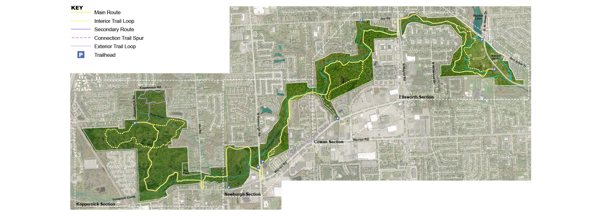 PEA Group developed a park master plan including trail and safety improvements at Holliday Nature Preserve. Wayne County Parks wanted to transform this underutilized park, which is currently divided into four sections by major road crossings, into one linear park. Our team conducted an initial evaluation of existing bridges, trails, wetlands, floodplain limits, and natural conditions of the site. Based on this assessment, we created a map to display the existing site conditions and the recommended improvements.