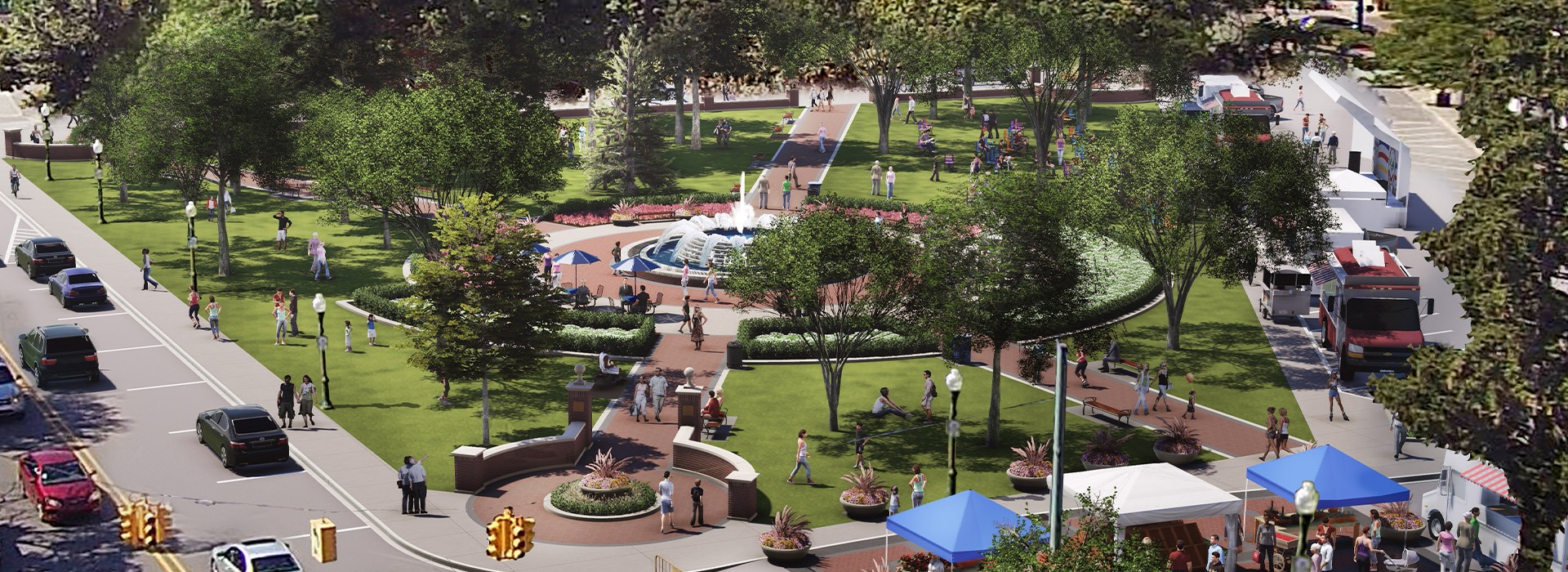PEA Group (formerly Russell Design) designed the park, including a beautiful, traditionally-designed fountain that serves as a focal point. The park includes brick walkways that lead to adjacent parking areas and street corners that offer easy access to open gathering areas and the park’s seasonal events. In 2015 the city developed a master plan for the park; however, none of the proposed ideas have been implemented yet.